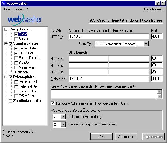 • Tragen Sie in Ihrem Browser den Webwasher als Proxy ein. In der Regel geschieht dies durch den Eintrag 127.0.0.1:8080 (8080 ist der Port, den Webwasher nutzt).